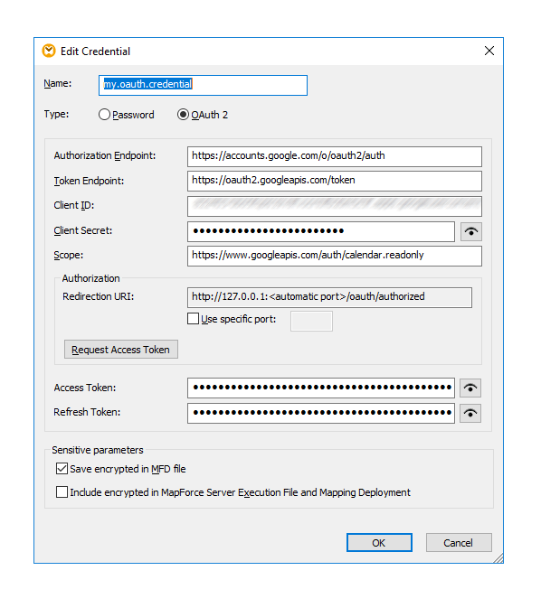 可以借助憑據對象將OAuth授權詳細信息傳輸到其他執行環境,例如MapForce Server和FlowForce Server。