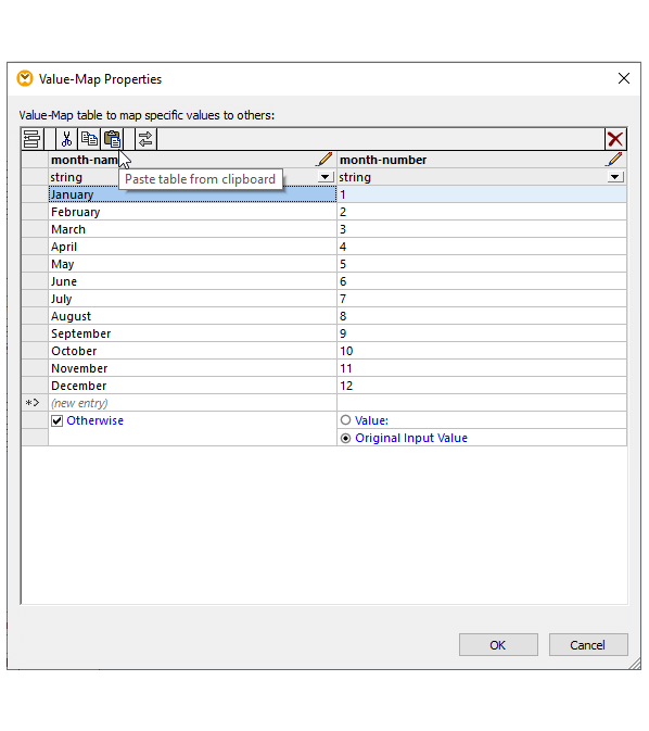 使用值映射組件,可以使用預定義的查找表將一個值替換為另一個值(例如,將1、2、3替換為1月、2月、3月)。從Altova MapForce 2020開始,可以將來自外部源(例如CSV或Excel)的表格數據(key-value對)粘貼到Value-Map表中。