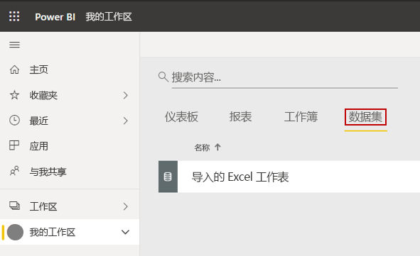導入工作簿的數據后,將在Power BI中創建一個數據集,該數據集將顯示在“數據集”下。