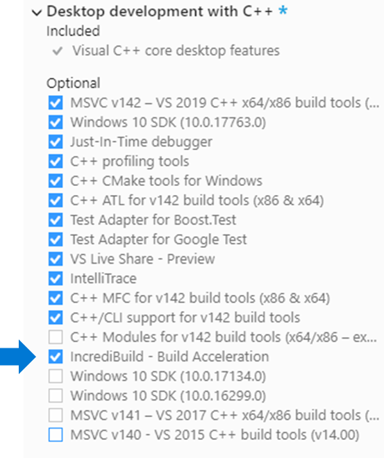 下載Visual Studio 2019安裝程序后,IncrediBuild將作為C ++工作負載的可選組件出現。