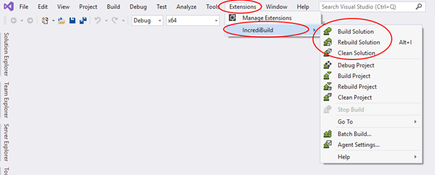 要使用IncrediBuild啟動構建,只需導航至“Extension”菜單,然后選擇一個構建選項(Build Solution、Rebuild Solution、Clean Solution)。如果已經通過IncrediBuild啟動了構建,并且想在Build Monitor上查看當前構建,只需導航至“View”菜單,然后選擇“IncrediBuild Monitor”。