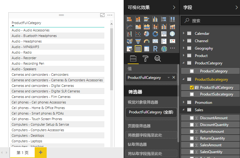 從“ProductSubcategory”表選擇“ProductFullCategory”列或或將其拖放到報表畫布,來創建一個顯示所有ProductFullCategory名稱的表。