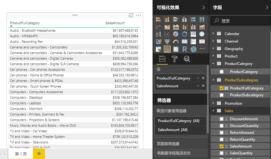 2、從“銷售”表選擇“SalesAmount”字段或將其拖動到表,以顯示每個產品完整類別的銷售額。