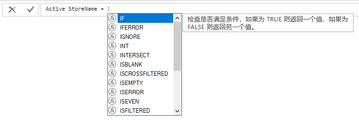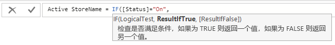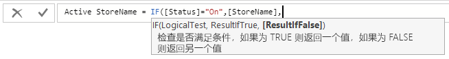 “商店”表中有一個名為“狀態”的列,其中值“開”用于活躍商店,而“關”則用于非活躍商店,我們可以使用該列創建新Active StoreName列的值。DAX公式將使用邏輯IF函數來測試每個商店的狀態,并根據結果返回特定值。如果商店狀態為“開”,公式將返回商店名稱。如果為“關”,則公式將分配“非活躍”Active StoreName。
