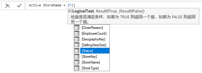 3、IF第一個參數是商店狀態是否為“開”的邏輯測試。鍵入一個左括號[ ,它會從“商店”表中列出列,然后選擇[Status] 。