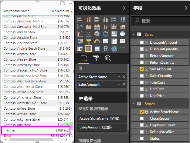 Contoso銷售示例包括針對活躍商店和非活躍商店的銷售數據。通過創建一個“Active StoreName”字段,可以確保報表中活躍商店的銷售額與非活躍商店的銷售額明確分離。在新的Active StoreName計算列,每個活躍商店將以商店的完整名稱顯示,而不是被組合到“非活躍”下。