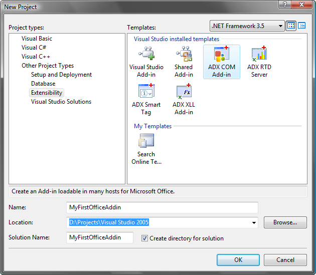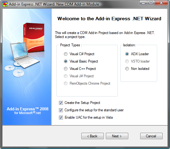 Add-in Express .NET is the first visual tool for programming Microsoft? Office extensions, including COM add-ins, smart tags, RTD servers and Microsoft Excel? user defined functions. It completely supports Microsoft Visual Studio .NET (2003, 2005, 2008) and makes it very comfortable for developing extensions for all available Microsoft Office versions from 2000 to 2007 (plus beta support for Office 2010).