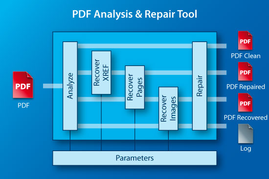 The 3-Heights? PDF Analysis & Repair component detects and repairs corrupted PDF documents in automated processing procedures. It repairs defective or illegible PDF documents or restores them as far as possible. The component analyses PDF documents with regard to PDF specifications and repairs them where indicated. It extracts legible content such as images or page fragments from irreparable documents and saves the data as a new document.