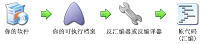 當(dāng) 一個軟件破解者嘗試破解一個編譯過的程序時,他會使用反 編譯器 具將機器語言代碼反 編譯 成另一種更容易讓人明白的代碼(例如 匯編語言 或者一種更高級的 程序語言 ),然后對于這反 編譯 成的語言進行研究。