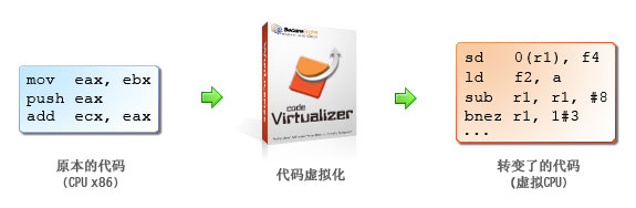 下圖展示了一個原來 編譯過的程序(在還沒有受保護時)以及當(dāng)它被 Code Virtualizer 保護時所經(jīng)過的 轉(zhuǎn)變。