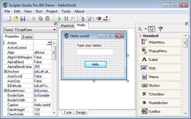 Integrated Development Environment (IDE) allow creating script projects at runtime with multiple cross-language scripts (Basic and Pascal) and forms