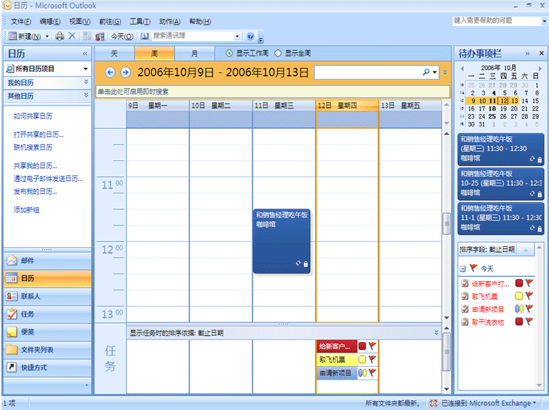 | 三、 | 更高效地管理時間和任務。 新增的 Office Outlook 2007 待辦事項欄將任務、帶有后續標志的電子郵件以及約會合并到一個視圖中。在 Office Outlook 2007 中計劃的任務將顯示在日歷上,您也可以直接將任務拖動到日歷上,以使您的工作井井有條。 |
