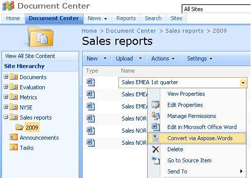| Having Aspose.Words for SharePoint installed you can convert documents right from your SharePoint document library between many popular office document formats and most of the conversions will be done with high fidelity.Currently Aspose.Words for SharePoint supports the following input formats: