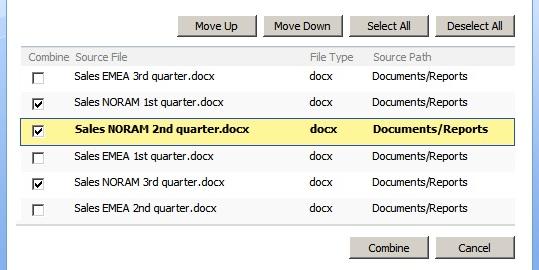 | Any combination of input files in supported formats can be converted into single output document. You can take files from all the subfolders in the document library, choose desired ones, adjust concatenation sequence via simple UI and get resulting combined file just by several clicks.   v\:* {behavior:url(#default#VML);} o\:* {behavior:url(#default#VML);} w\:* {behavior:url(#default#VML);} .shape {behavior:url(#default#VML);} <!--[if !vml]--><!--[endif]-->  |