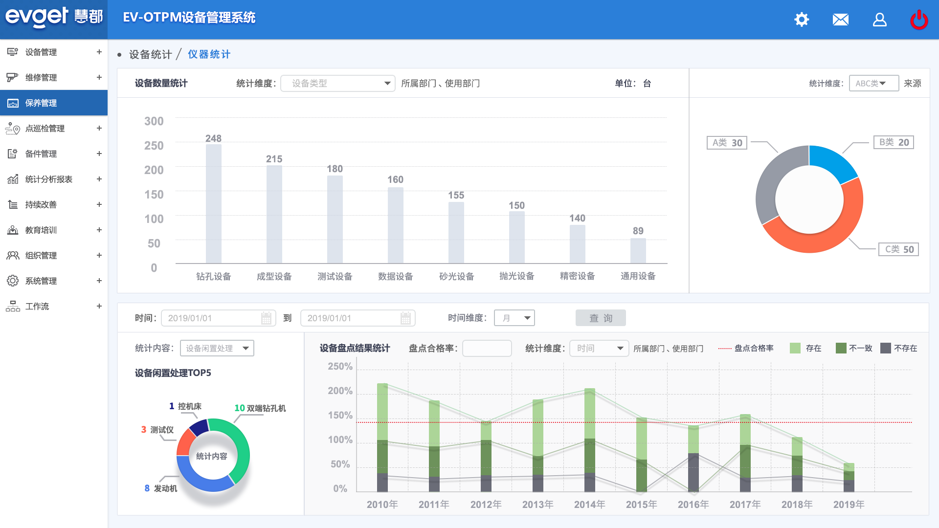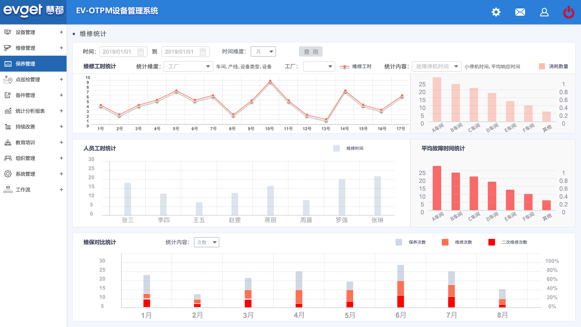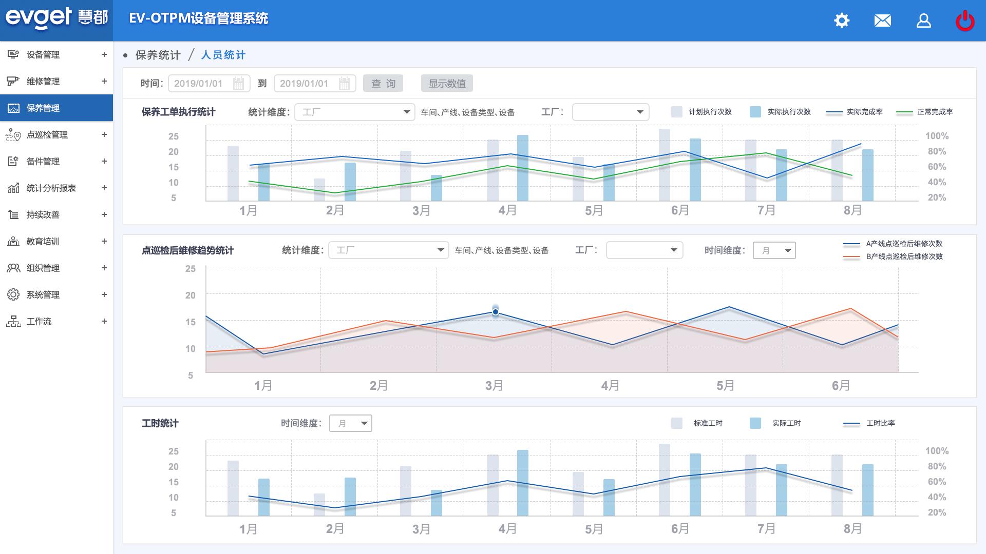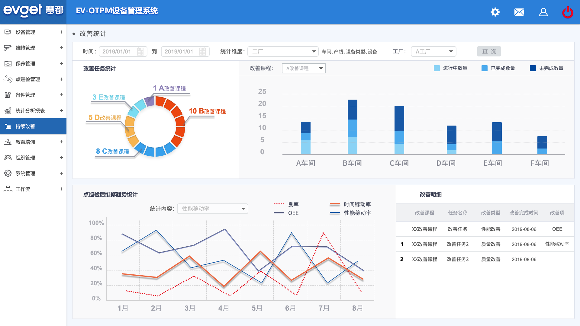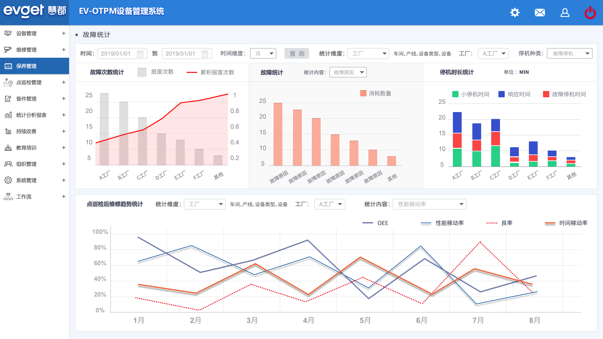 車間現場電子看板EV-OTPM是慧都科技17年行業經驗與技術沉淀之作,以國際ISA95為標準、以六西格瑪精益管理為核心理念,打造出一套成熟的輕量化設備管理系統,從購置、臺賬、保養、點巡檢、維修到報廢對設備進行全生命周期管理,幫助企業實現設備的規范化、科學化、智能化管理,降低設備故障率、保持設備穩定性、實現設備資源的充分利用。