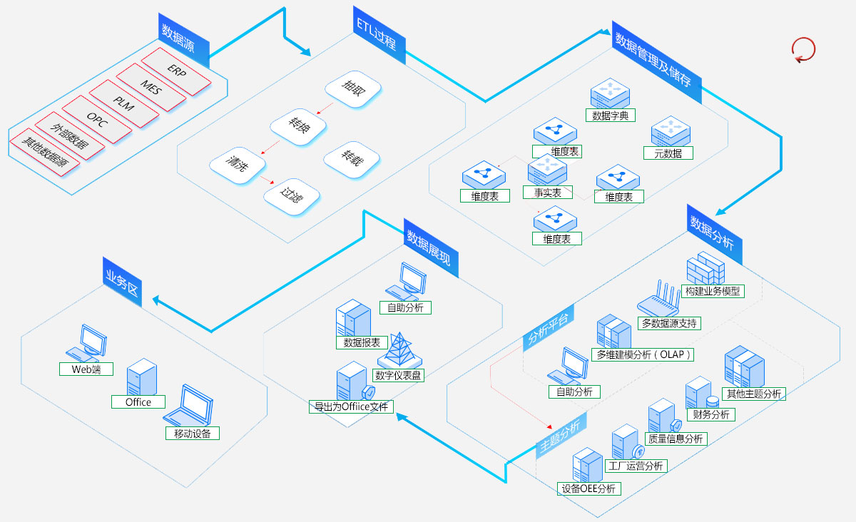 EV-BI結合精益生產管理理論,對智能制造的推行提供可視化的輔助手段,通過分析各業務模塊數據,來建立高效、統一、共享的大數據分析平臺,確保您的產品滿足從生產到交付的客戶期望。